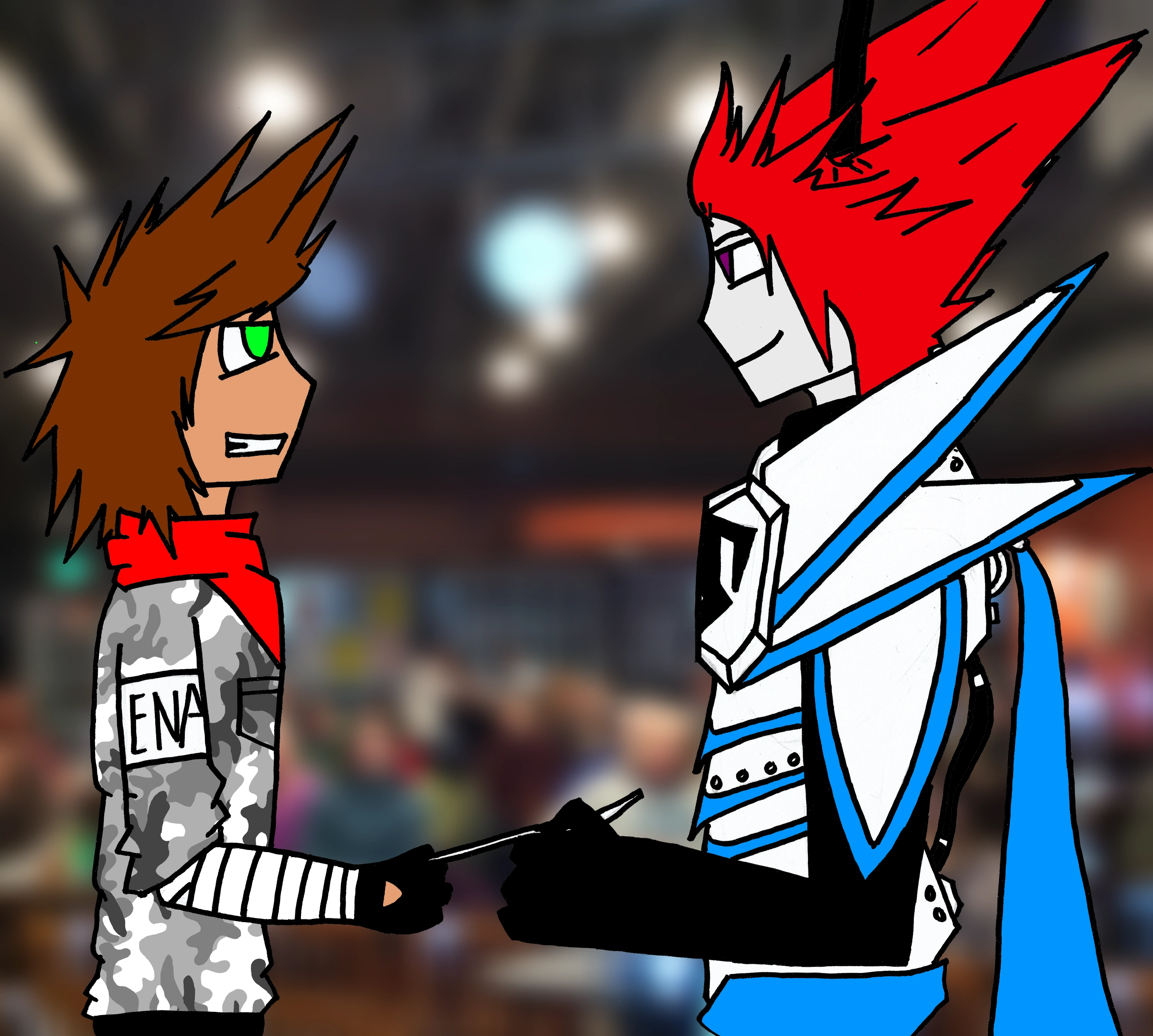When Jay in on a mission he will usually wear the standard ENA military attire with his own addition of features. Depending on his environment; forest, desert, arctic, etc, Jay wears the appropriate camouflage to blend into his environment. Jay rolls the sleeves up and wraps his forearms in a layer of fabric. he also wears fingerless leather gloves on both hands. On his feet are a pair of military boots that go past his angles. he wears long, baggy pants which are held up by a black leather belt. on the side of his belt is a samurai sword which he stole from a 'Ninjabot' during the Colonial Fringe Wars. Jay wears a red scarf around his neck and on his knees are a pair of knee guards.